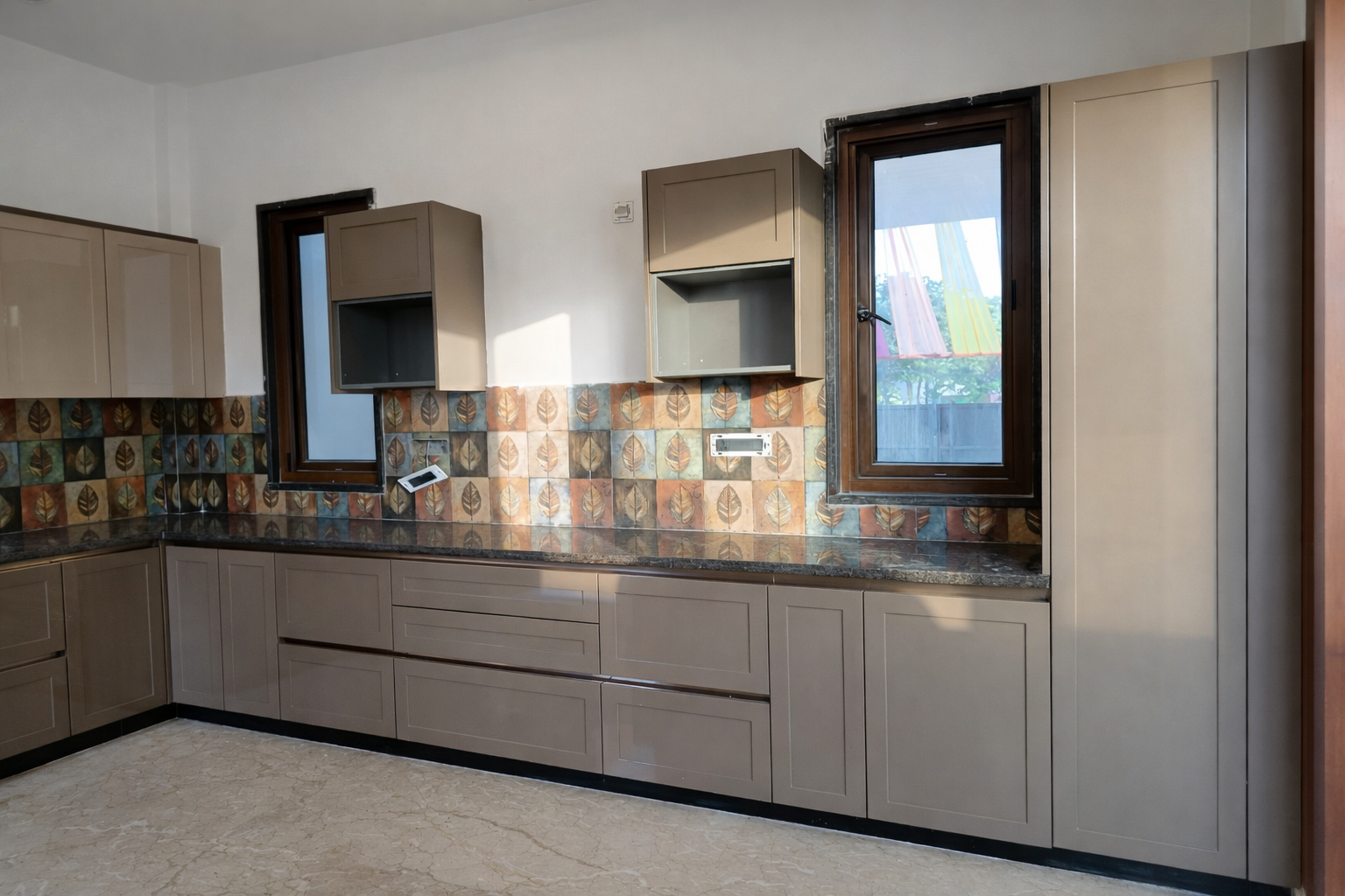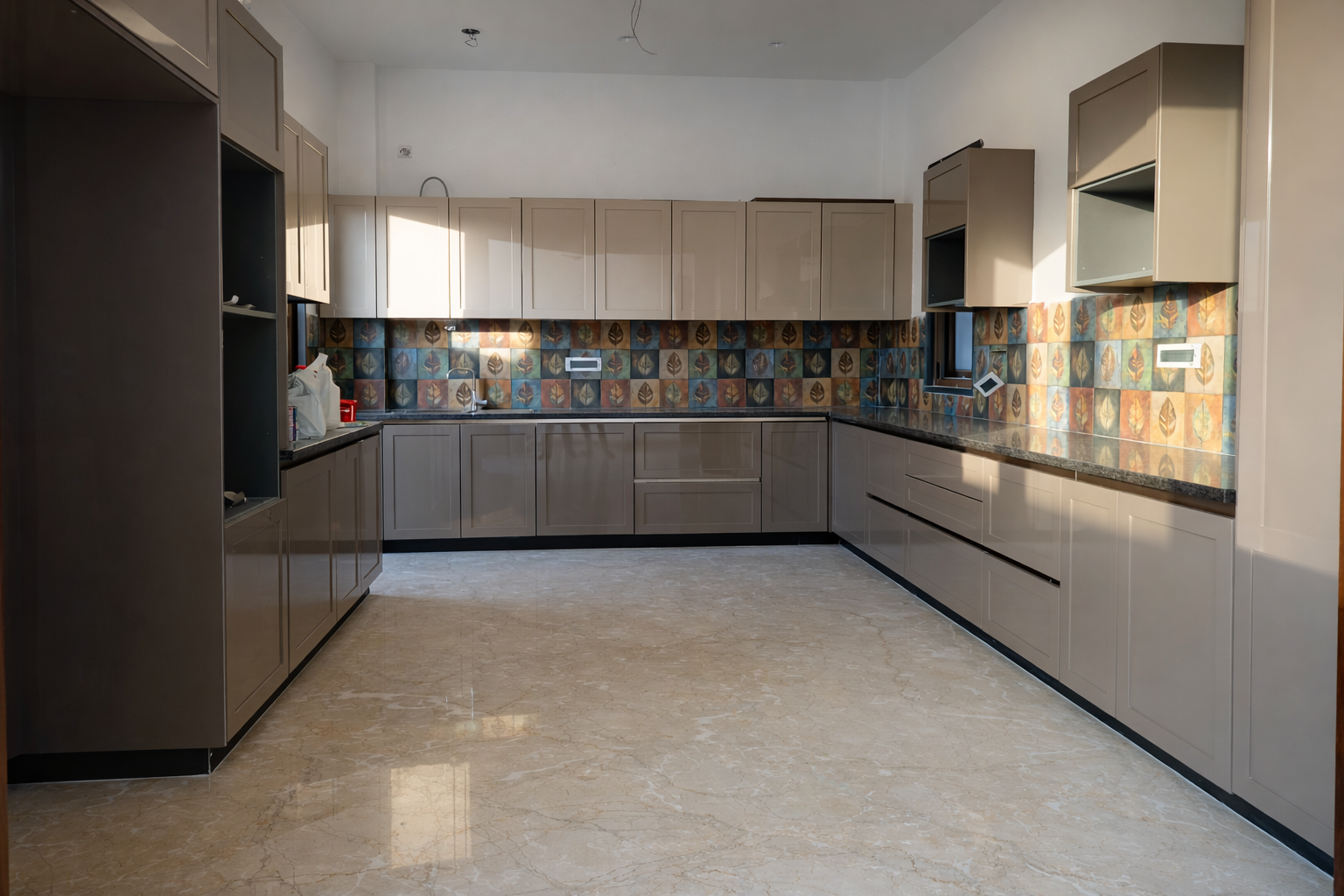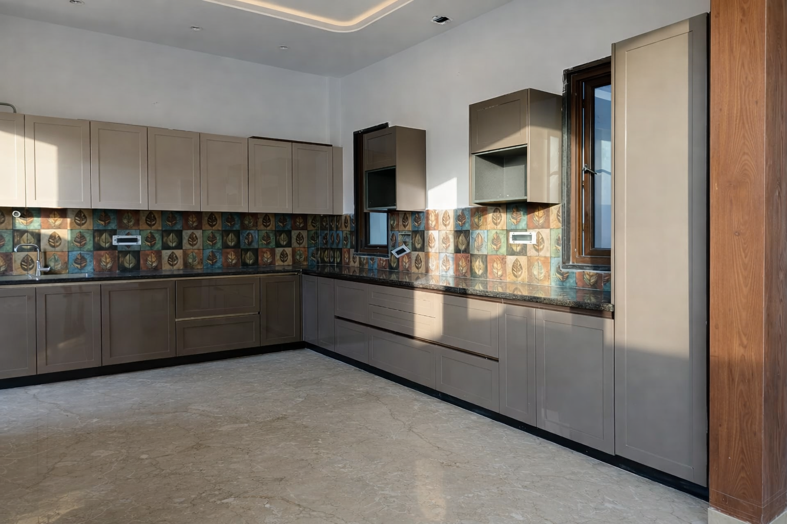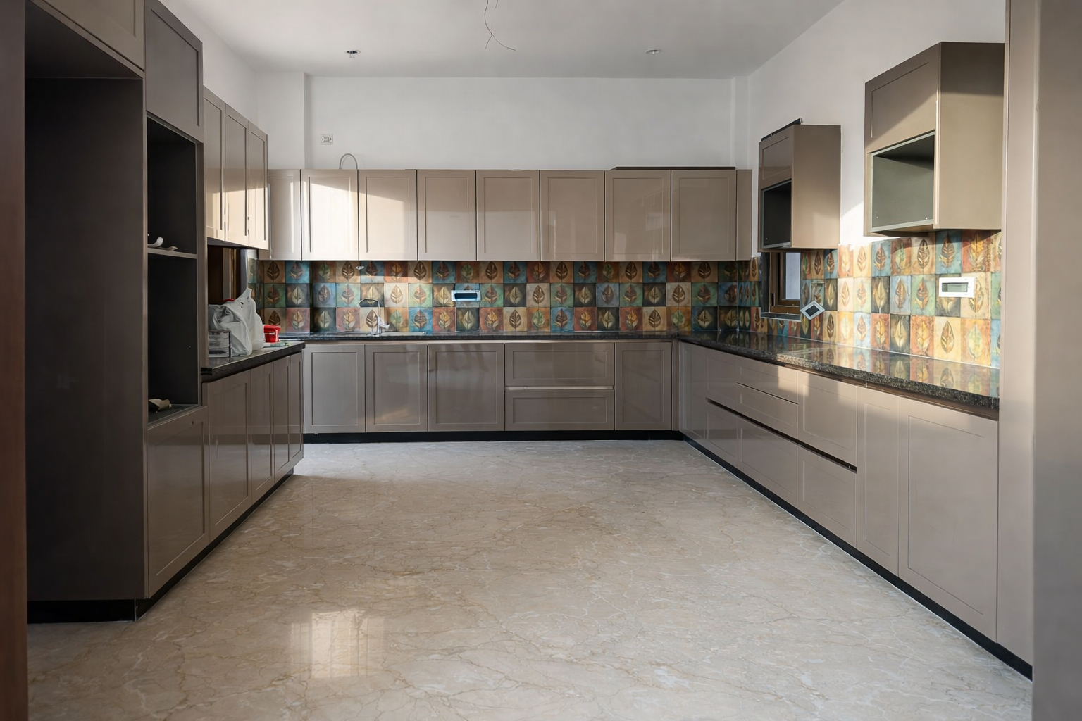 For this project, we chose a spacious U-shaped layout. This shape is perfect for a Modern Kitchen Design because it keeps everything within easy reach. We focused on space optimization to ensure the room never feels crowded. We planned a perfect workflow by keeping the stove, sink, and fridge close together. This smart usability allows multiple family members to cook together without bumping into each other.