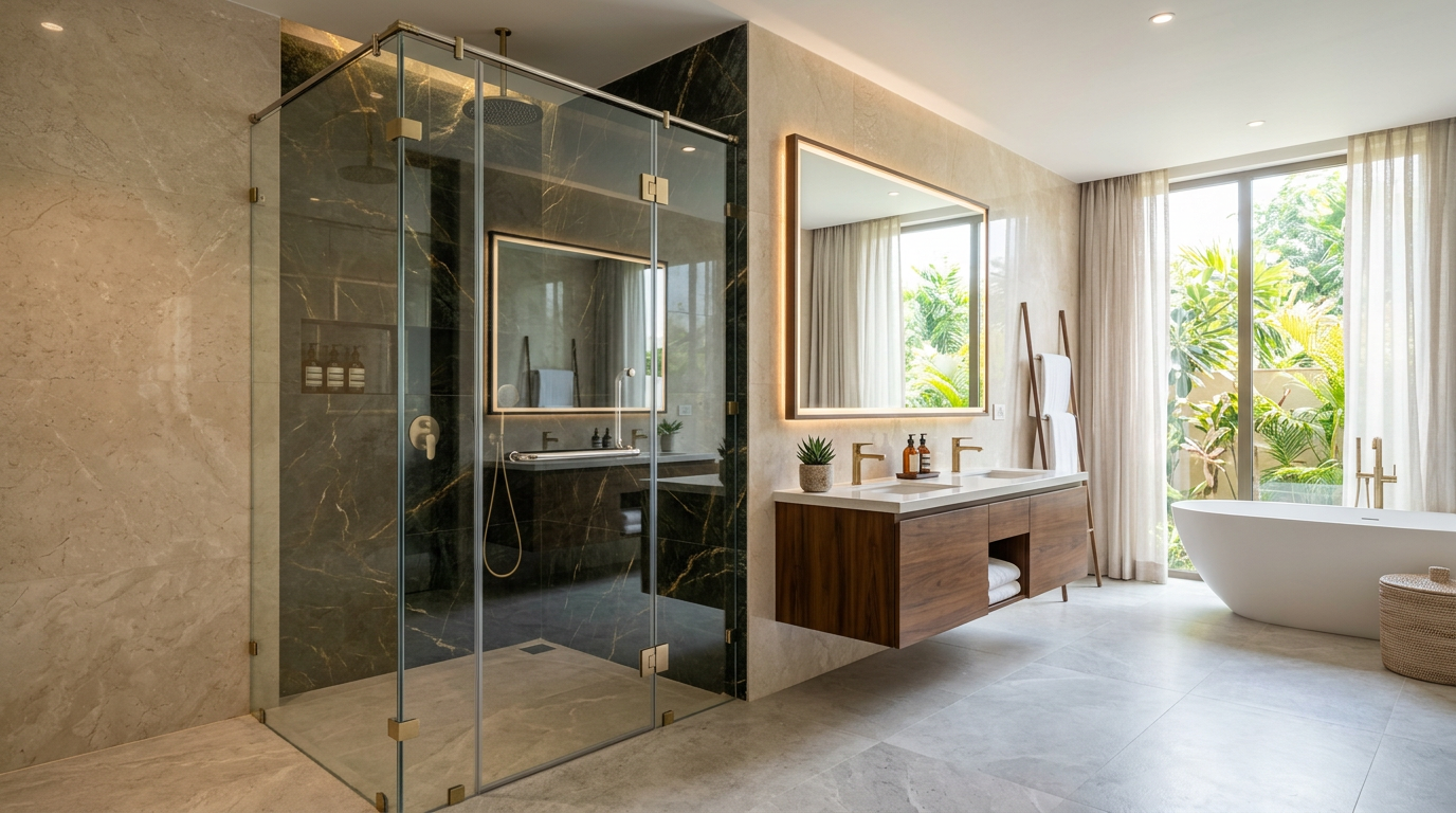 3. Glass Selection: We help you choose the right glass. You can pick clear glass for an open look or frosted glass for privacy. We also discuss the hardware finish, like chrome or matte black, to match your taps.